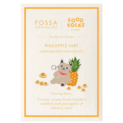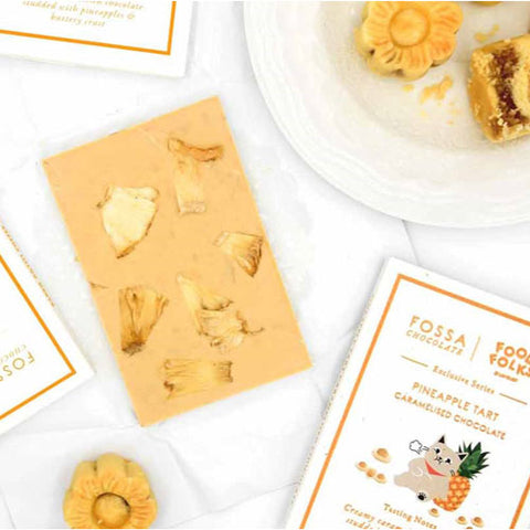 This bar of creamy caramelized blond chocolate contains pineapple chunks, buttery crusts, and has a biscuity texture. Inspired by a local festive snack in Singapore, its addictive flavor is sure to leave you wanting more. This craft chocolate bar is made by Fossa Chocolate in Singapore. 50 grams.