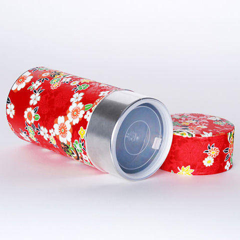 Bright flowers and leaves decorate a red colored washi paper on this unique tea tin. The high quality tea tin will add a sophisticated touch to your tea tray or countertop.